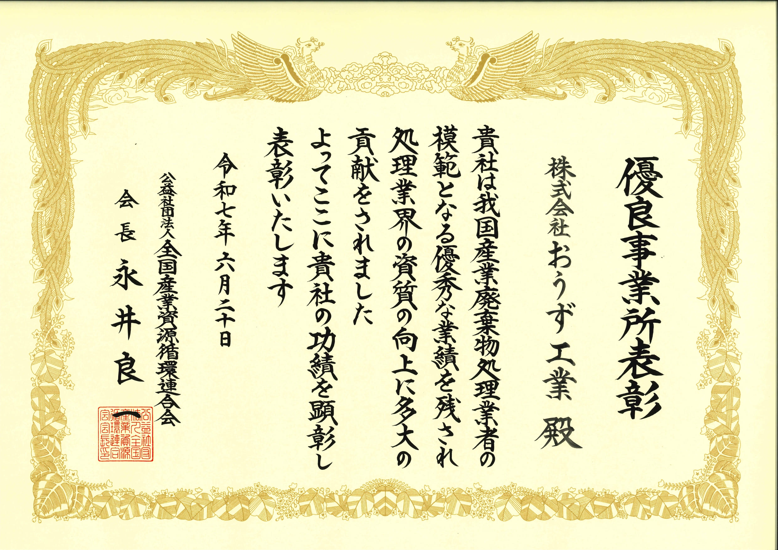 令和7年6月20日に、公益社団法人全国産業資源循環連合会より、【優良事業所表彰】をいただきました。