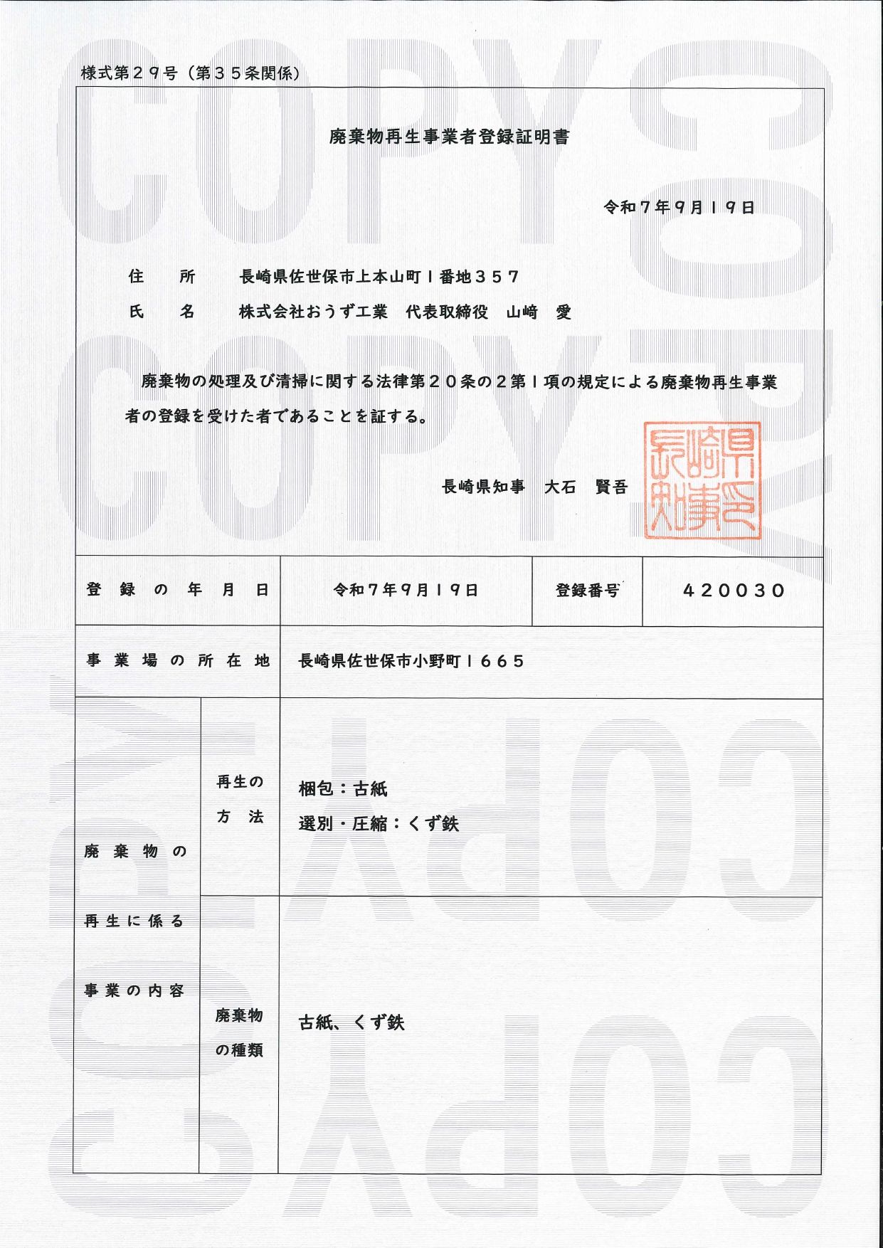 廃棄物再生事業者登録取得いたしました。
